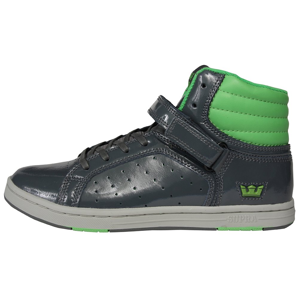 The youth Suprano High skate shoes from Supra feature a synthetic upper for a great look. The key features are: SupraFoam midsole absorbs shock and provides flexibility; Keep it fresh with the extra pair of laces (included); PU insole offers superior cushioning; and Vulcanized gum rubber outsole is flexible and offers optimum traction.